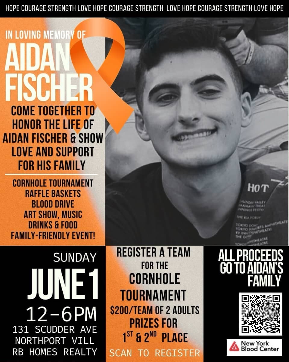 Those wishing to can continue to honor Aidan Fischer’s memory by donating to his GoFundMe page here. The May 20 blood drive at the Northport Yacht Club will take place from 3 to 7:30pm. For more information and to register, click here. Sign up for RB Realty’s June 1 cornhole tournament and fundraiser here. All proceeds will go to the Fischer family. Artists looking to submit artwork to “Art for Aidan” show (the theme is Love, Hope, Strength, Courage) should text 646-825-1384 for details.