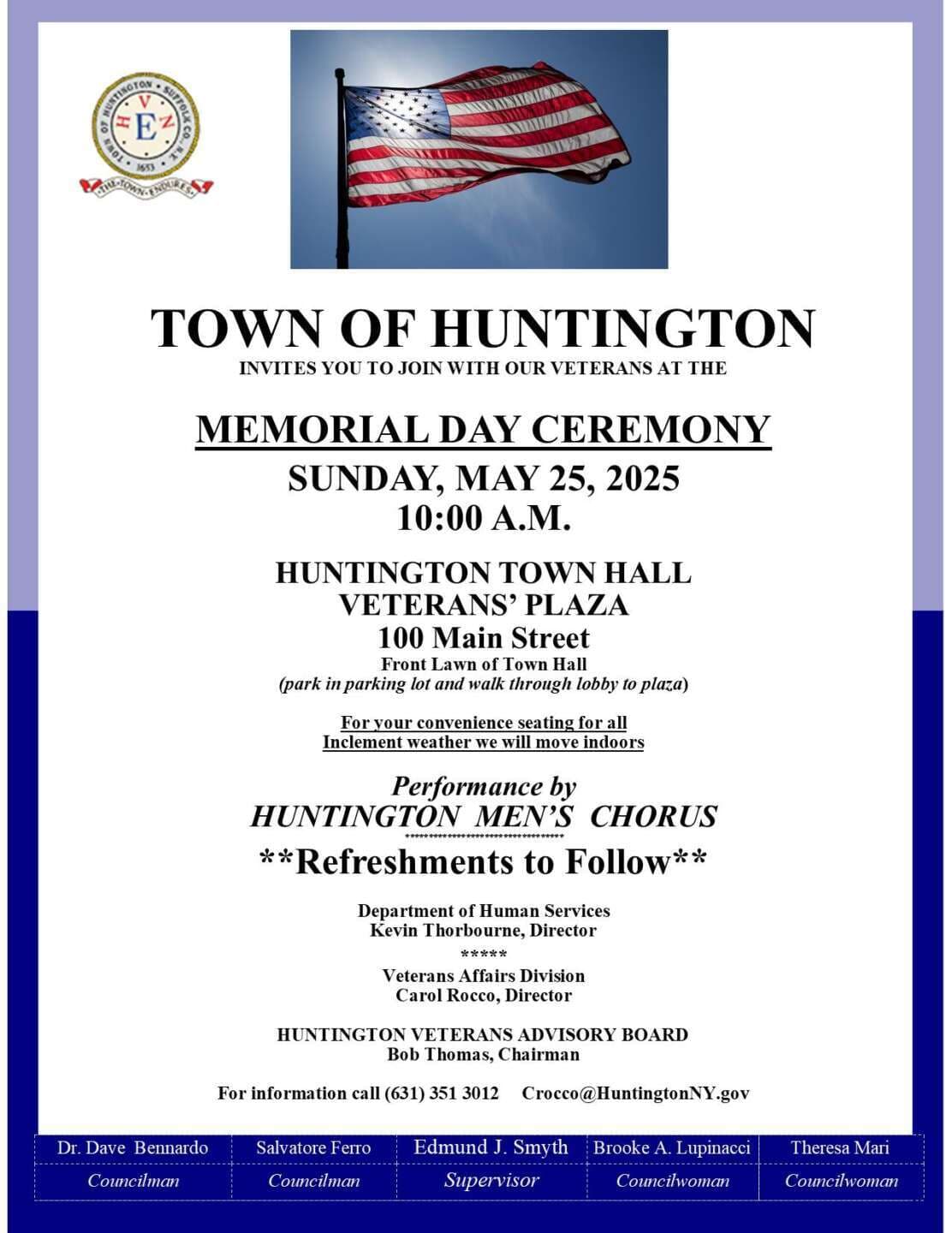 The public is invited to join TOH officials in honoring fallen servicemen and women at Huntington Town Hall on Sunday, May 25, at 10am in commemoration of Memorial Day. The ceremony will take place at Veterans Plaza at Town Hall, with a performance by the Huntington Men's Chorus and refreshments to follow. Seating will be available for all.